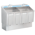- Photocell and knee controlled water flow and knee controlled soap flow at each station